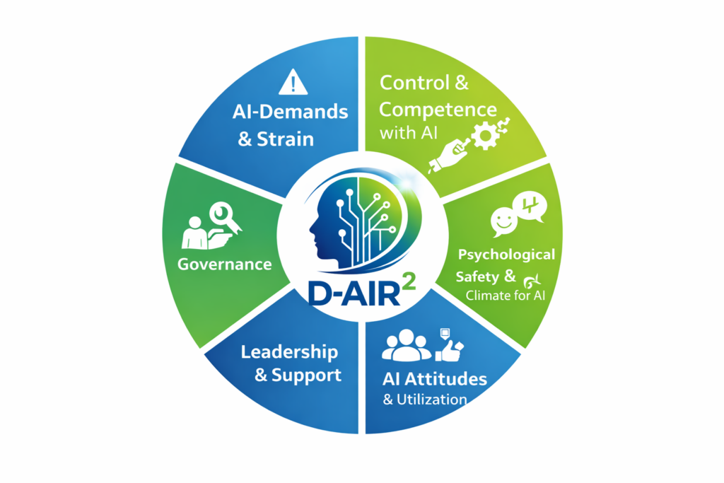 Aktuell befindet sich D-AIR² in der konzeptionellen und empirischen Entwicklungsphase. In Kürze wird diese Website umfassende Informationen zum Modell, zu den zugrunde liegenden Dimensionen, zu ersten Forschungsergebnissen sowie zu praxisnahen Anwendungsformaten (z. B. Readiness-Checks, Benchmarking, Management-Reports und Entwicklungsmaßnahmen) bereitstellen.